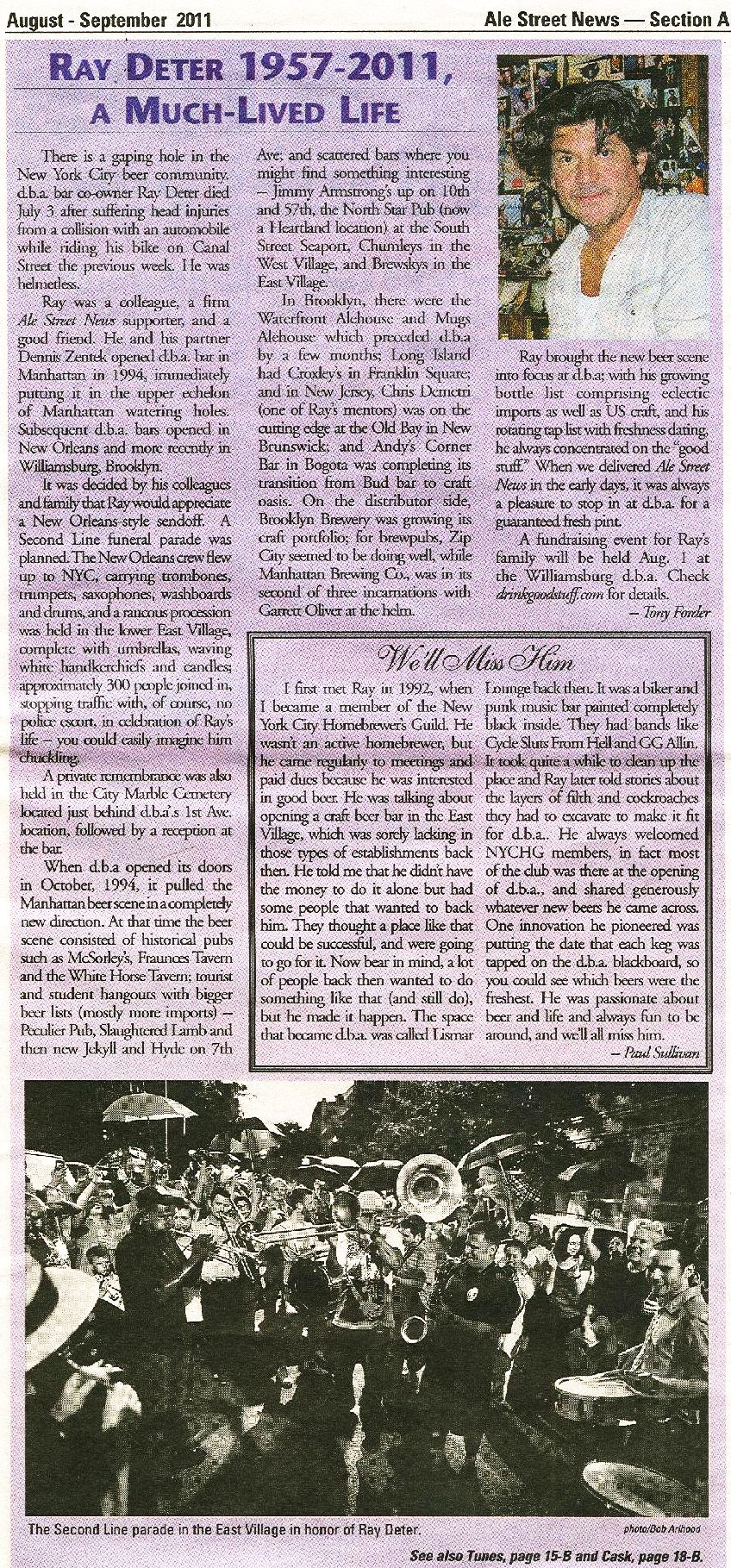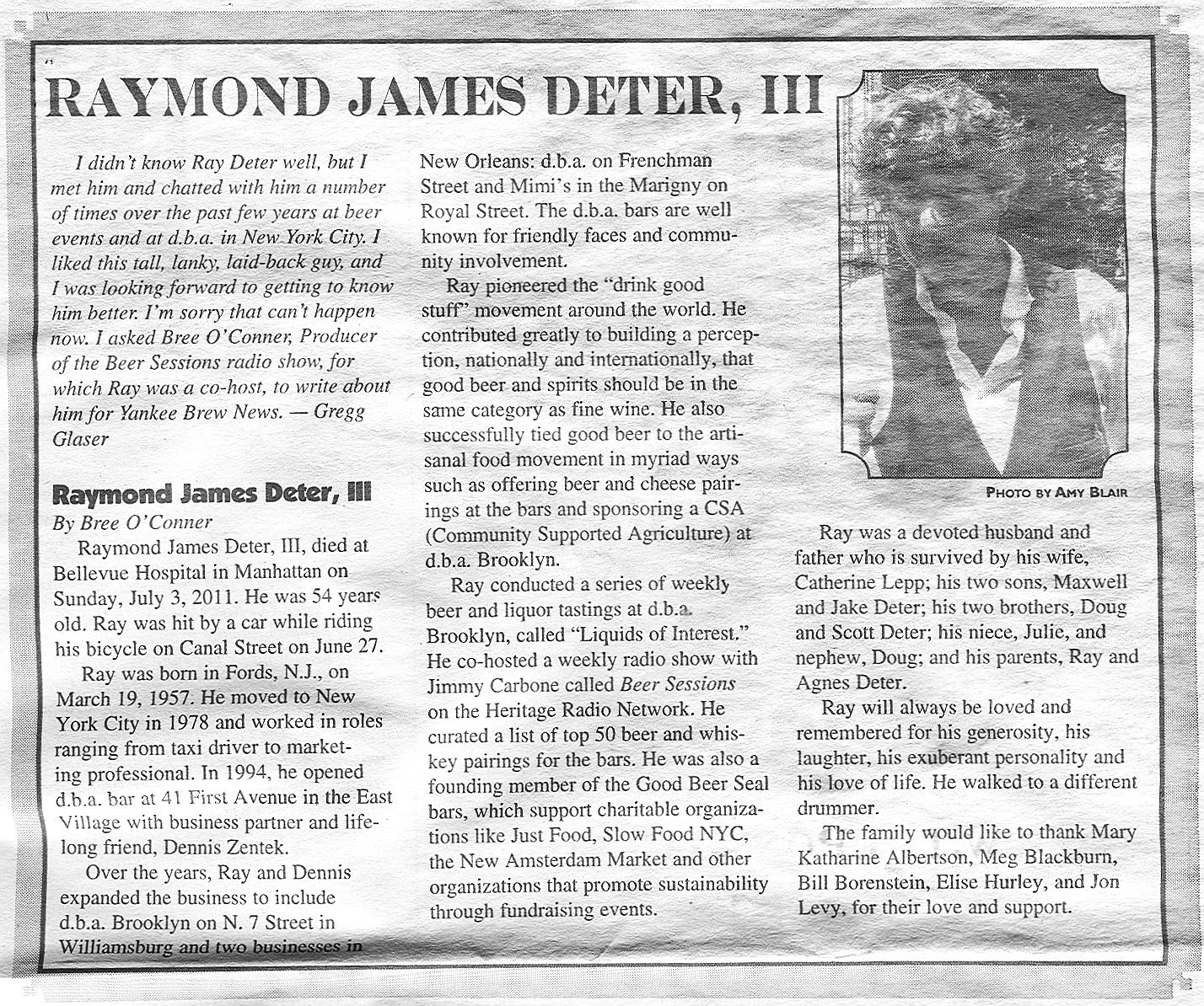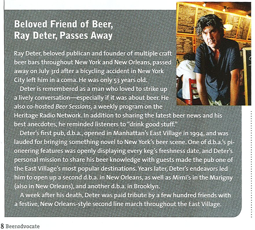 This website is designed to be a lasting tribute to Ray Deter, 1957-2011, a pioneering and groundbreaking bar owner in New York City and New Orleans. When Ray (with Dennis Zentek) opened 'd.b.a.' in Manhattan in 1994, a bar with a total focus on craft beers (it was NYC's first with cask beer in modern times) and quality spirits, the oasis in the desert was finally with us - and was no mirage. The way was paved for New York City's craft beer revolution to follow its course. Thank you Ray!
