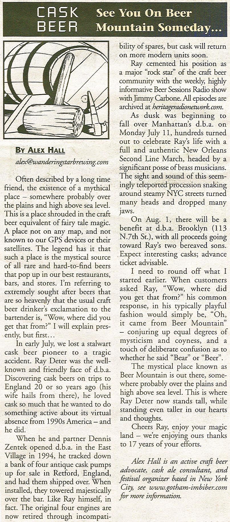 This website is designed to be a lasting tribute to Ray Deter, 1957-2011, a pioneering and groundbreaking bar owner in New York City and New Orleans. When Ray (with Dennis Zentek) opened 'd.b.a.' in Manhattan in 1994, a bar with a total focus on craft beers (it was NYC's first with cask beer in modern times) and quality spirits, the oasis in the desert was finally with us - and was no mirage. The way was paved for New York City's craft beer revolution to follow its course. Thank you Ray!